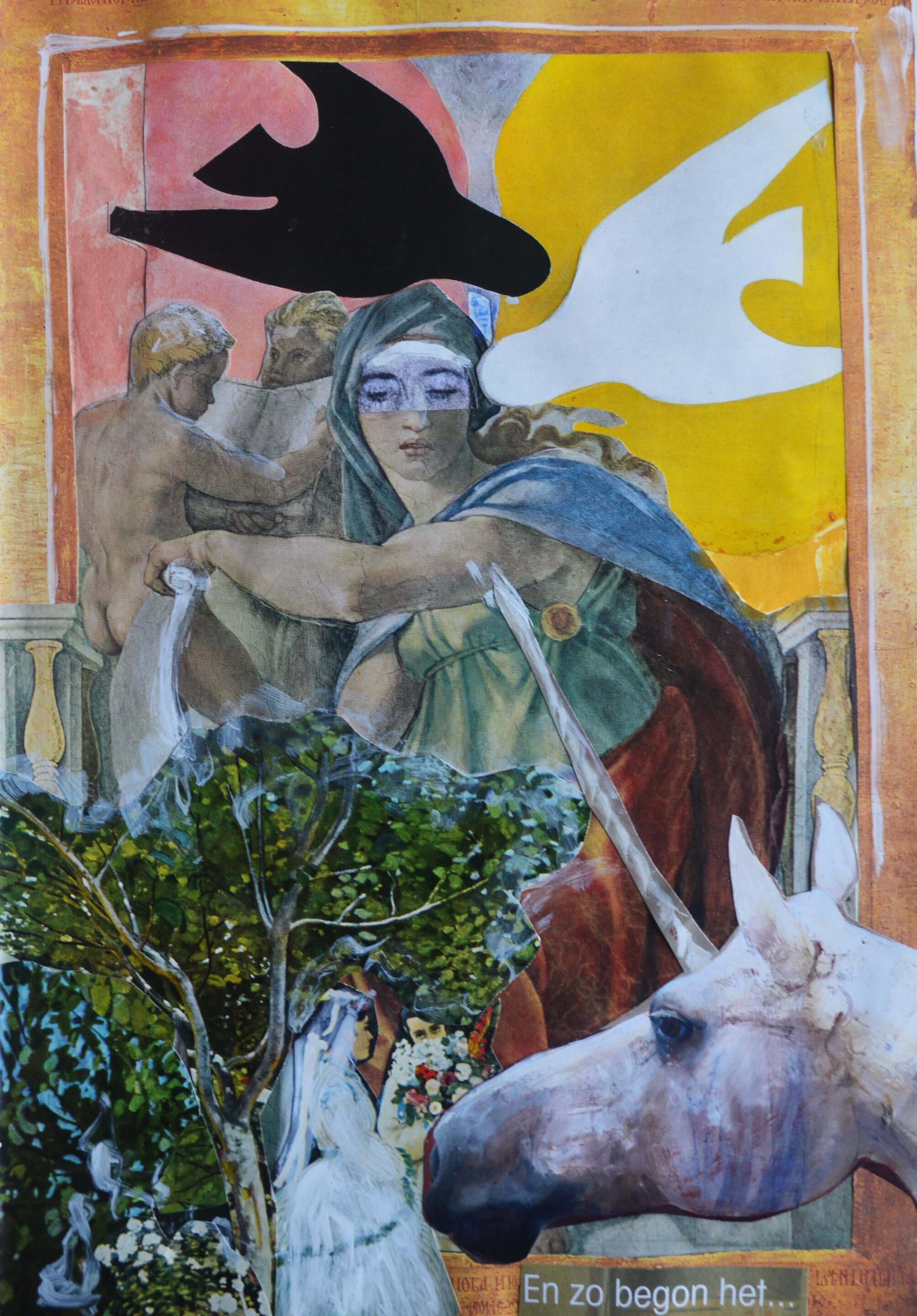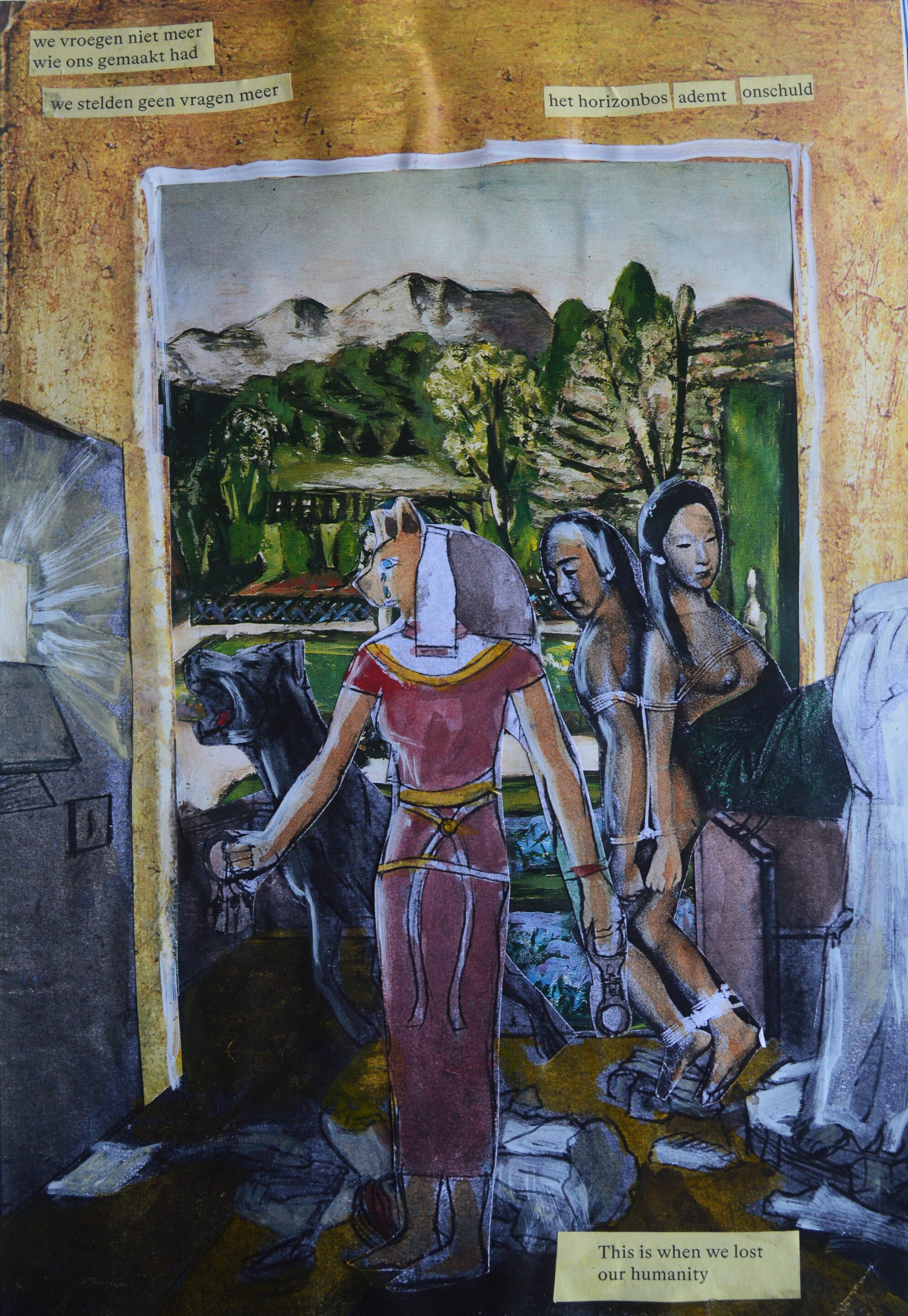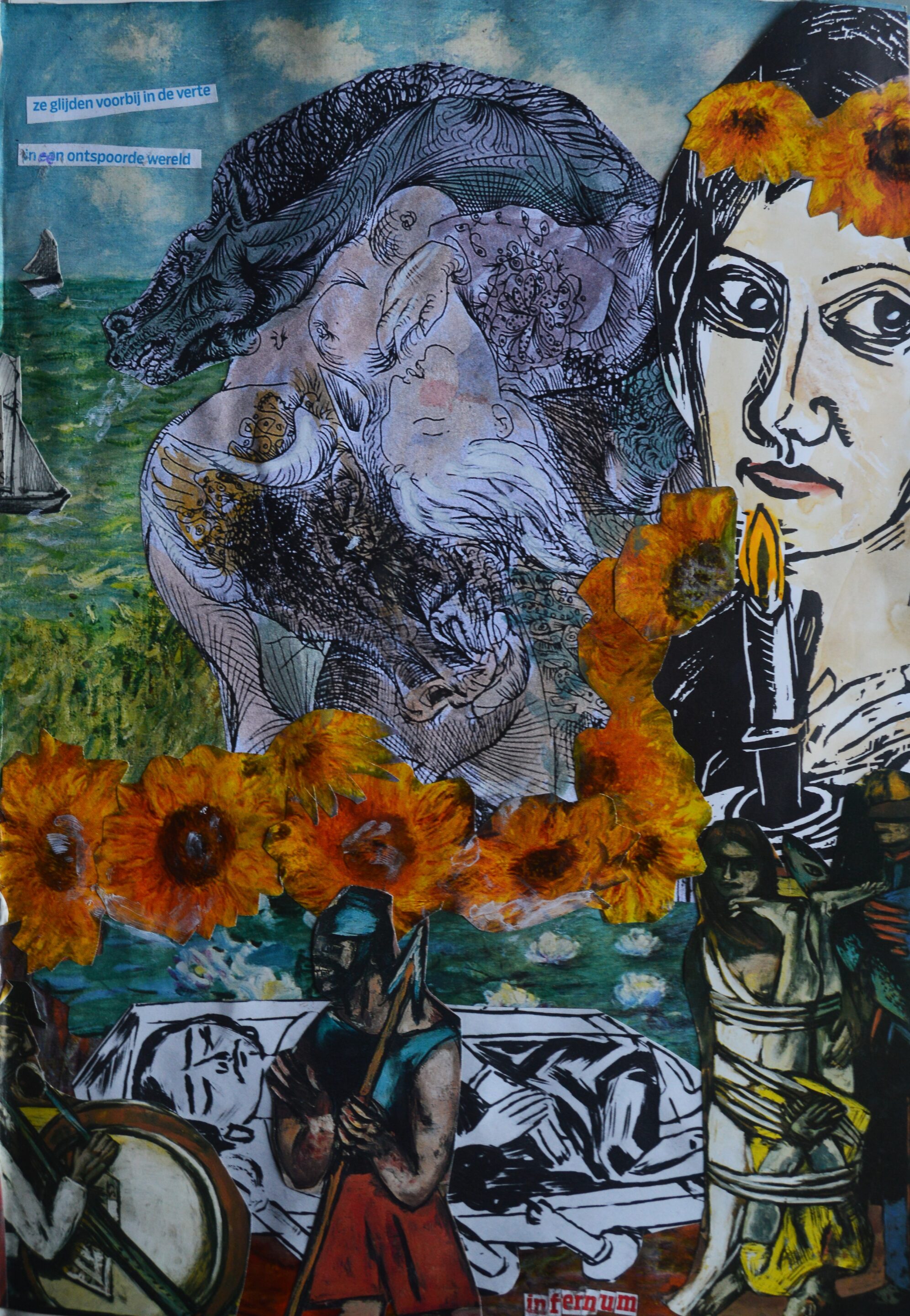 Thoughts are little graphics, drawings or collage’s I make to loosen up from the intensity and concentration whom I need when making huge drawings. I scrutinise my inner life to discover. I just see what happens while working with various techniques. Sometimes a world is vast and I stay to make a series of it.